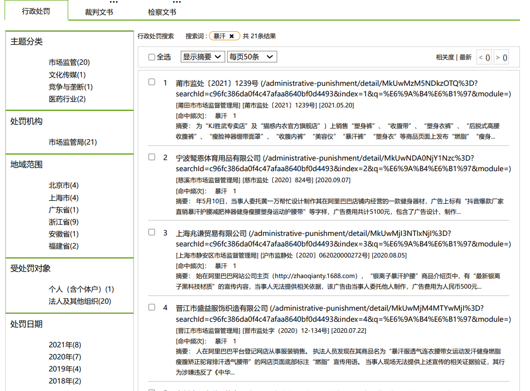 在威科先行案例检索网站中,此类处罚有21条,行政处罚原因为:标有燃脂的产品没有任何真实数据证实,存在有虚假或者引人误解的内容。如晋市监处字〔2020〕12-134号《行政处罚决定书》指出:当事人发布与商品有关的功能等信息与实际情况不符,对购买行为有实质性影响的,违反了广告法第四条第一款、第二十八条第二款第(二)项,构成发布虚假广告宣传的行为。