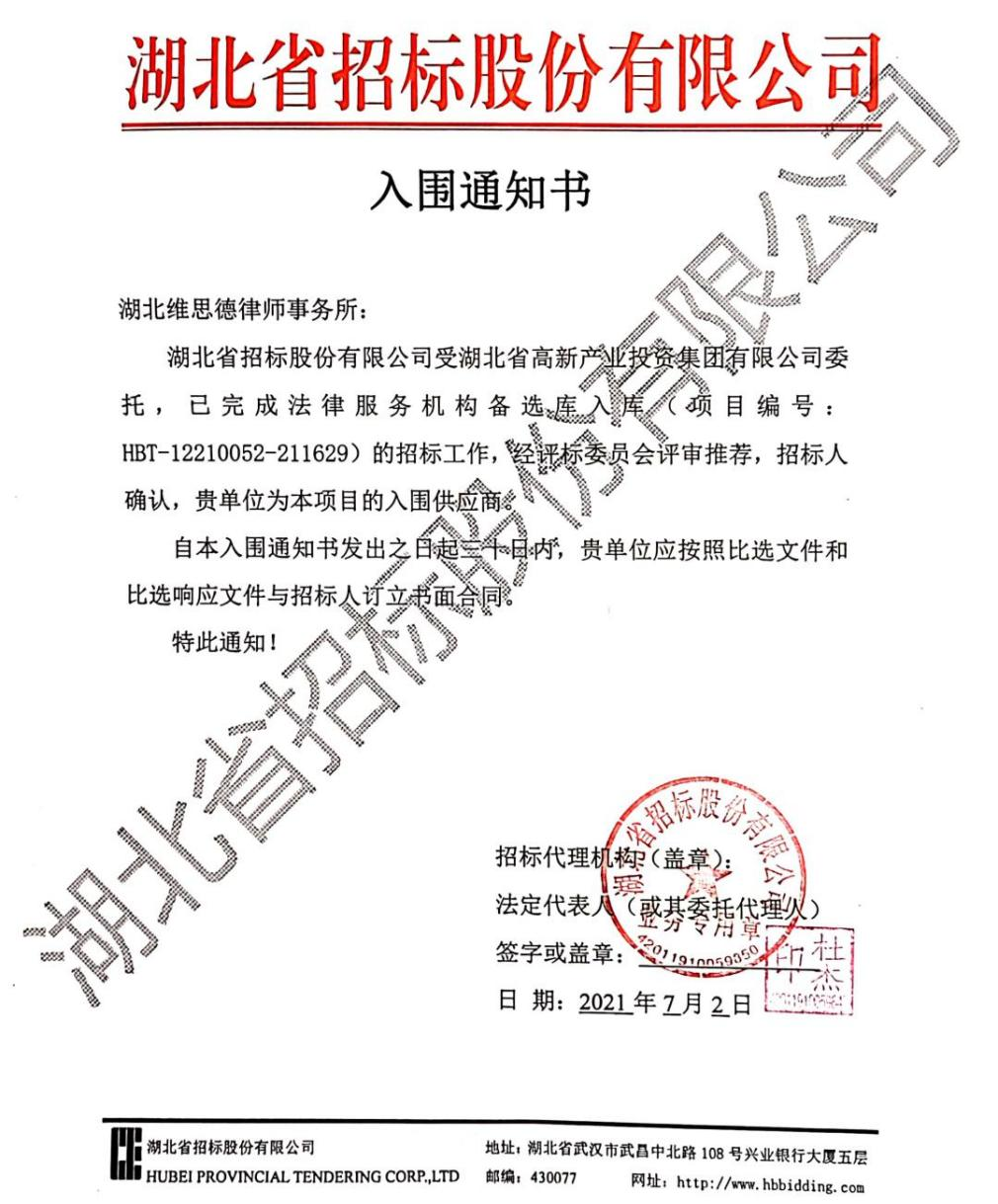 2021年7月2日,湖北维思德律师事务所成功入围湖北省高新产业投资集团有限公司(“湖北高投集团)2021年3季度-2023年2季度法律服务项目机构备选库。