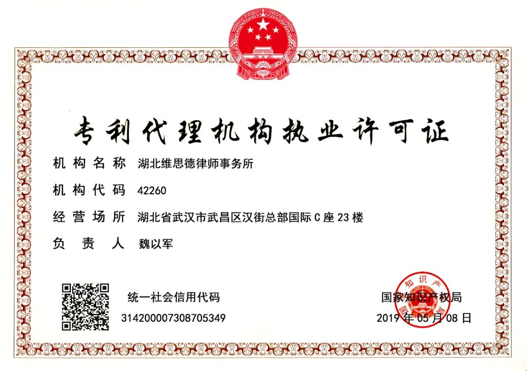 2019年5月,维思德取得了专利代理机构执业许可证,标志着维思德律所成为湖北省内为数不多的同时具有律师事务所执业许可证和专利代理机构执业许可证的“双证”事务所。