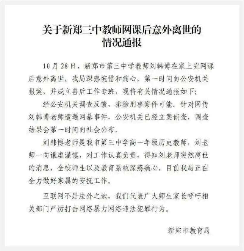 近日,河南新郑三中女教师在连续多天给学生上网课时被“爆破”后于家中心梗死亡一事,引发全网关注。