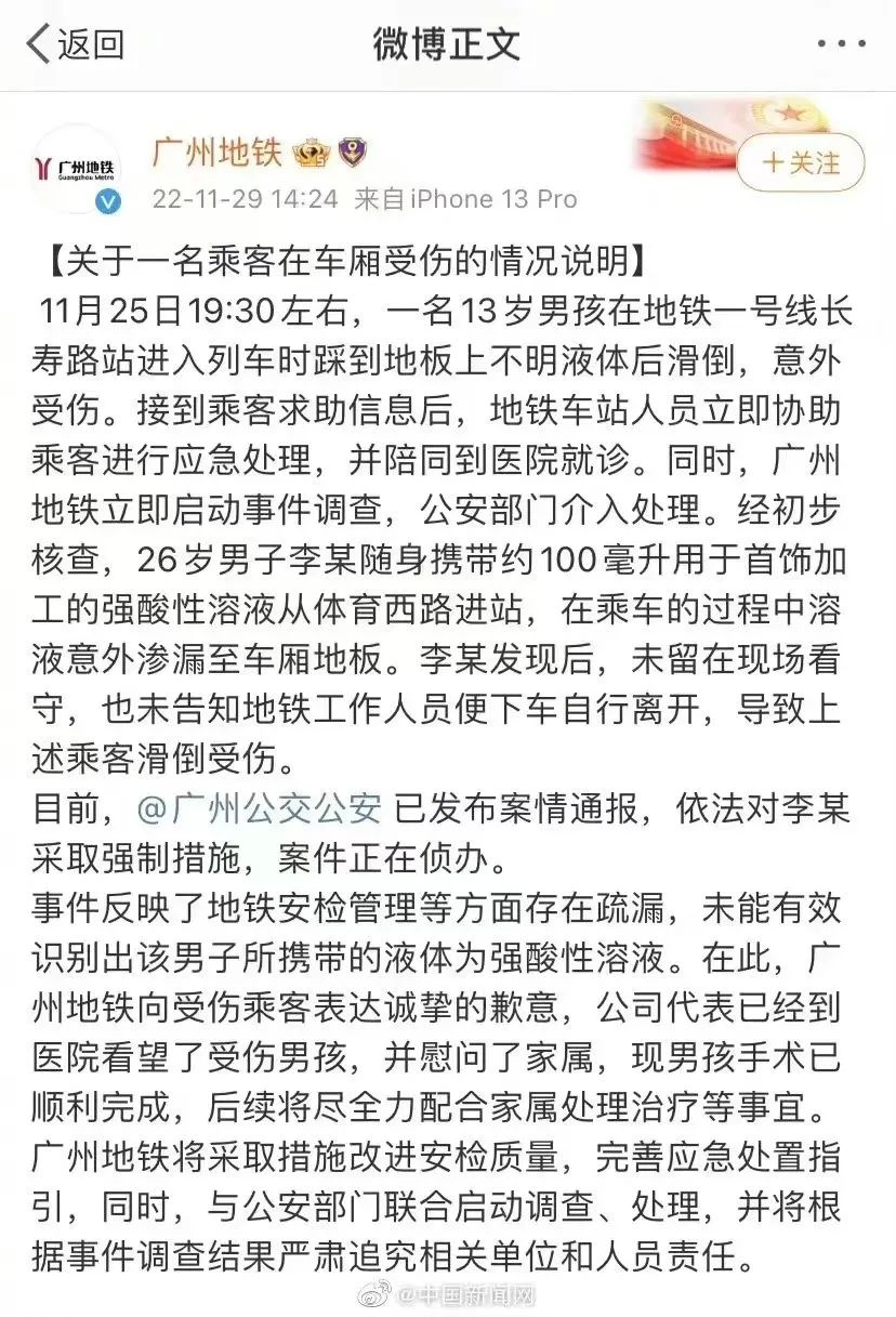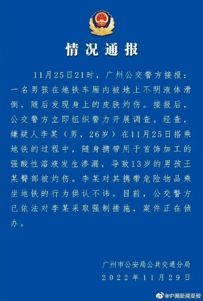 2022年11月25日,一名男孩在广州地铁车厢内被地上不明液体滑倒,随后发现身上的皮肤灼伤,该事件在网上引起广泛关注。