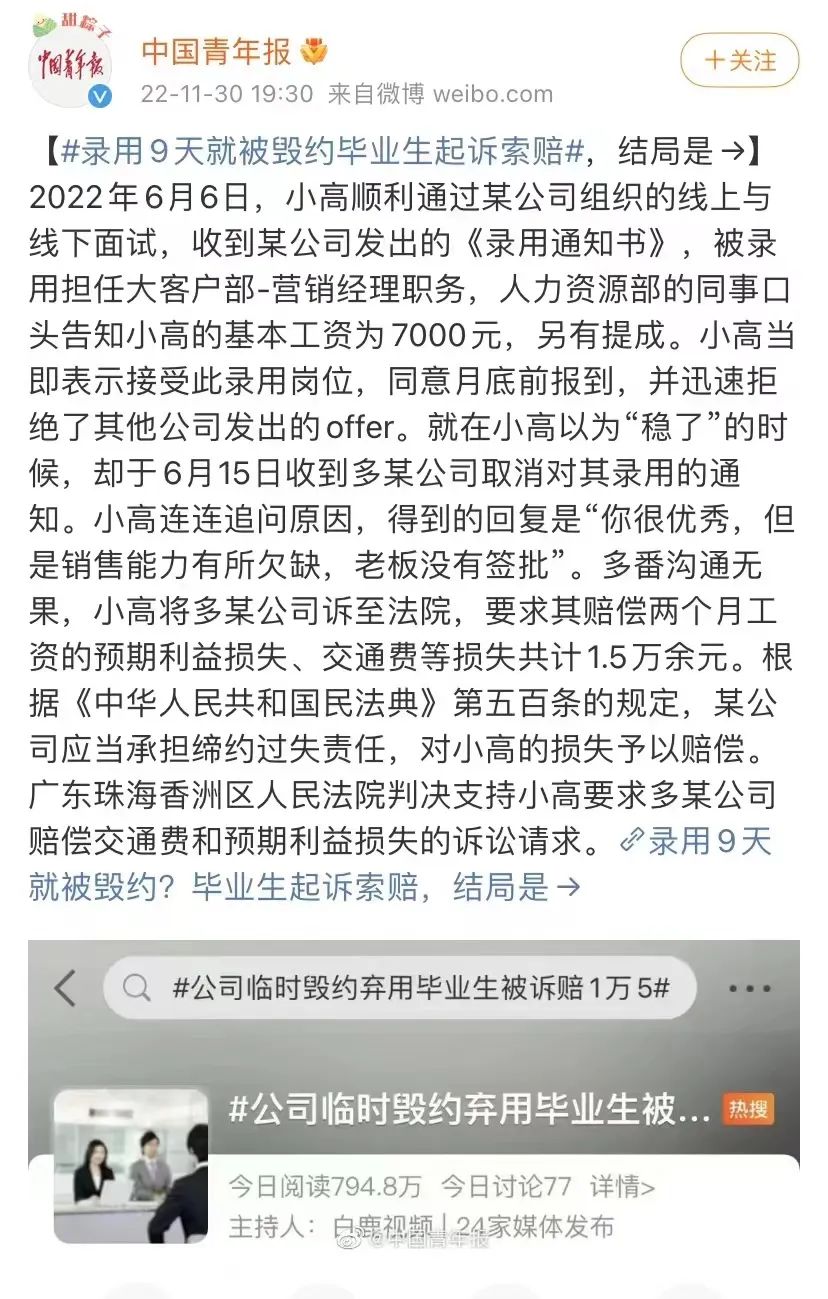 近日,一则《录用9天就被毁约,毕业生起诉索赔》的帖子引起网友热议。2022年6月6日,高某作为毕业生顺利通过某公司组织的线上和线下面试,并收到该公司发出的《录用通知书》,被录用担任大客户部-营销经理职务,人力资源部的同事口头告知其基本工资为7000元,另有提成。高某当即表示接受此录用岗位,同意月底前报到,并立即拒绝了其他公司发出的offer。就在高某等待上岗的期间,却于6月15日,收到该公司取消对其录用的通知。高某连连追问原因,得到的回复是“你很优秀,但是销售能力有所欠缺,老板没有签批”。双方多番沟通协商无果,高某只得将该公司诉至法院,请求赔偿两个月工资的预期利益损失、交通费等损失共计1.5万余元。广东珠海香洲区法院于近日做出判决,支持高某诉讼请求。