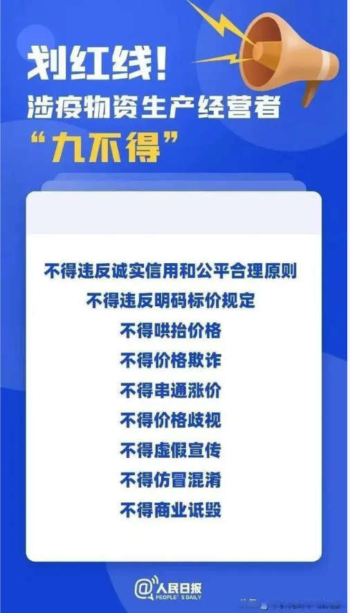 12月9日,市场监管总局就发布了《关于涉疫物资价格和竞争秩序提醒告诫书》,对涉疫物资生产经营者划出“九不得”红线——不得违反诚实信用和公平合理原则、不得违法明码标价规定、不得哄抬价格、不得价格欺诈、不得串通涨价、不得价格歧视、不得虚假宣传、不得仿冒混淆、不得商业诋毁。此举旨在规范价格行为、维护公平竞争,也为不法经营者敲响警钟。