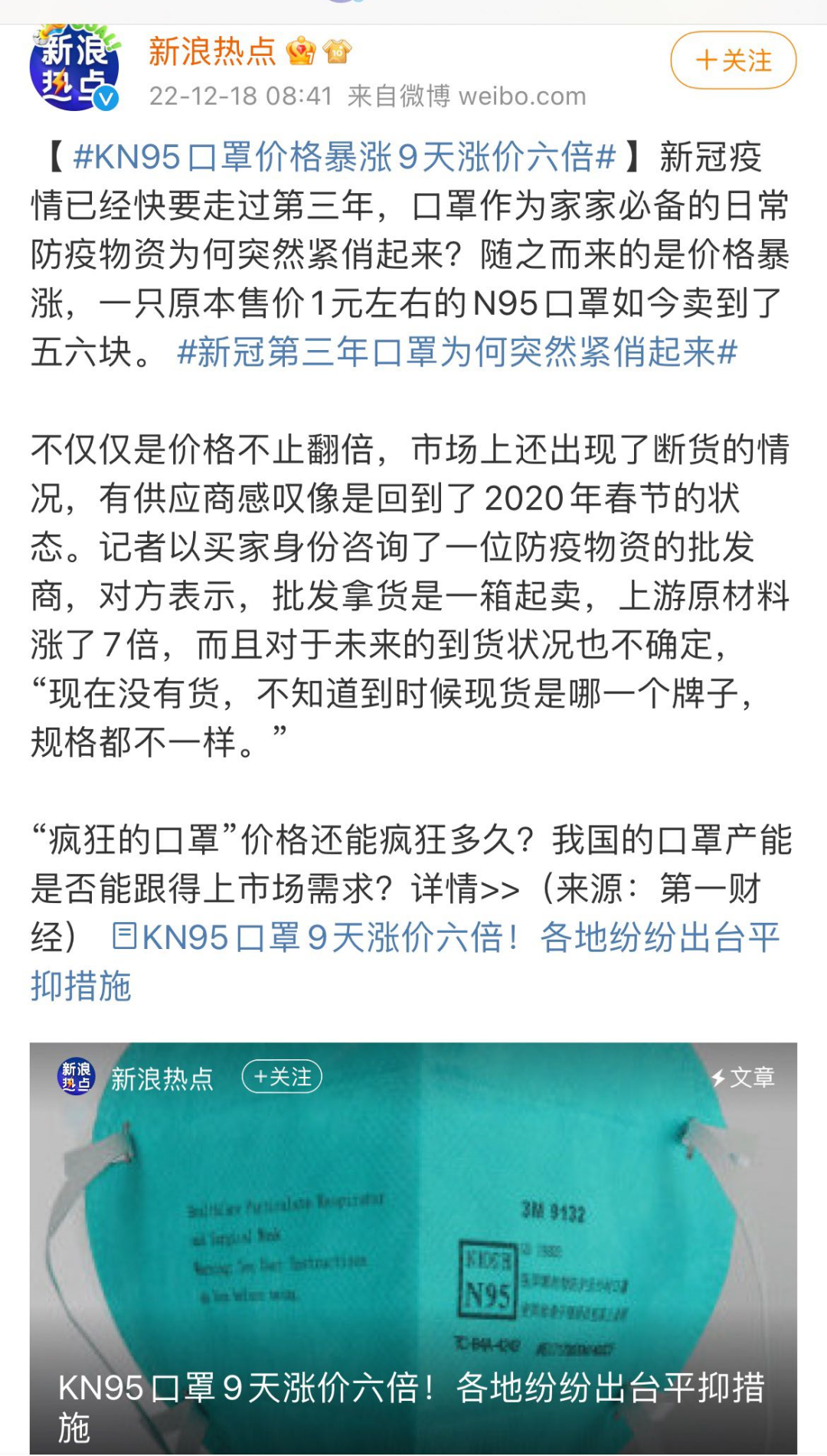 近日,浙江省绍兴诸暨市市场监管局立案查处了一家涉嫌哄抬口罩价格的商家,该商家9天时间将所有销售的kn95(非医用)口罩从每包18.68元涨至139.90元,涨幅达648.9%。在全国各地,除了kn95口罩外,连花清瘟、布洛芬、抗原自测盒等其他防疫物资的价格也出现了不同程度的暴涨,平时二三十元左右一盒的连花清瘟胶囊,价格暴涨到了一盒一百元。面对这种乱象,北京、浙江等地市场监管部门纷纷“出手”,严厉打击违法行为。