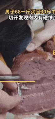 1月7日,河南泌阳。余先生在熟食店按一斤68元的价格购买30斤牛肉,回家切开后发现里面有一张硬硬的纸,上面还写着英文。余先生表示,一开始切的时候以为是脆骨,后来发现是纸条,想不明白为什么肉里会有纸条,当时就不敢吃了。将肉拿回店里,商家表示已吃了一部分肉,所以退钱也只退了剩下的一部分。余先生称,少退了1斤6两不说,主要商家卖这种肉实在不妥,希望大家别踩雷。
