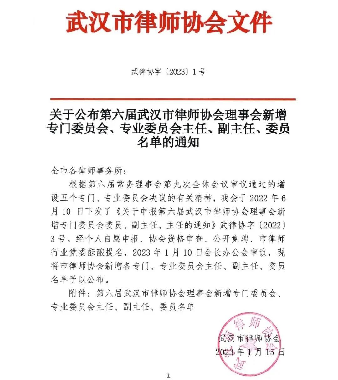 武汉市律师协会第六届常务理事会第九次全体会议审议通过了增设五个专门、专业委员会的决议。2023年1月,武汉市律协发布《关于公布第六届武汉市律师协会理事会新增专门委员会、专业委员会主任、副主任、委员名单的通知》,维思德律所7名律师当选,其中: