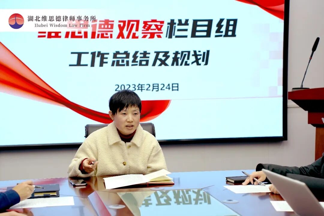 2023年2月24日下午4时,我所“维思德观察”栏目组召开了2022年度工作总结及2023年度工作规划会议,会议由“维思德观察”栏目主编冯颖琼律师主持,栏目组全体成员参加。