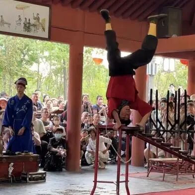 “天下第一名刹”少林寺,因历代少林武僧潜心研创的少林功夫而扬名天下,素有“天下功夫出少林,少林功夫甲天下”的美誉。少林武僧展示了十八般兵器、象形拳、八段锦、双枪刺喉、飞针穿玻璃等武艺,赢得阵阵喝彩。我所两位同事也致敬经典,圆梦武侠,向少林高僧学习高难度动作,将现场氛围拉到高潮。