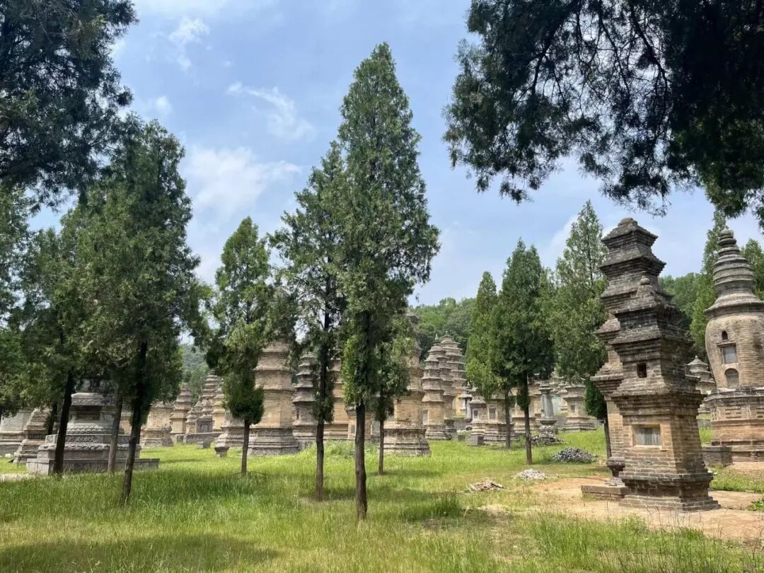 出常住院向西而行,映入眼帘的是一片宏大的古塔群——少林塔林,现存唐、五代、宋、金、元、明、清历代200多座砖塔和石塔,是我国最大的塔墓群,塔类繁多、大小参差、高低不同,粗细不一,形状各异,塔体上多有精美的图案和浮雕。