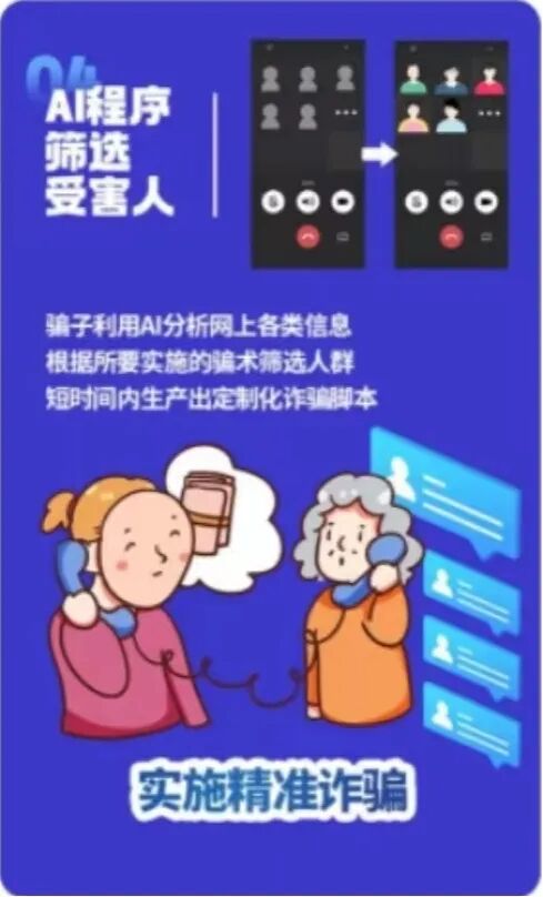 骗子利用AI技术分析网上发布的各类信息,筛选出各类特征人群,通过制作定制化诈骗脚本,实施精准诈骗。例如,筛选出经常发布感情类信息的人群,可以冒充网友实施情感诈骗;筛选出经常搜索工作招聘信息,可以冒充客服实施兼职诈骗等等。