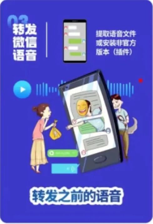 微信虽然没有语音转发功能,但骗子通过AI 技术提取语音内容或者安装非官方版本能够实现该功能,因此骗子在盗取微信号或者QQ号后,便向被害人提出要求各种转账的要求,同时借助语音转发而获得被害人信任,进而实施诈骗。