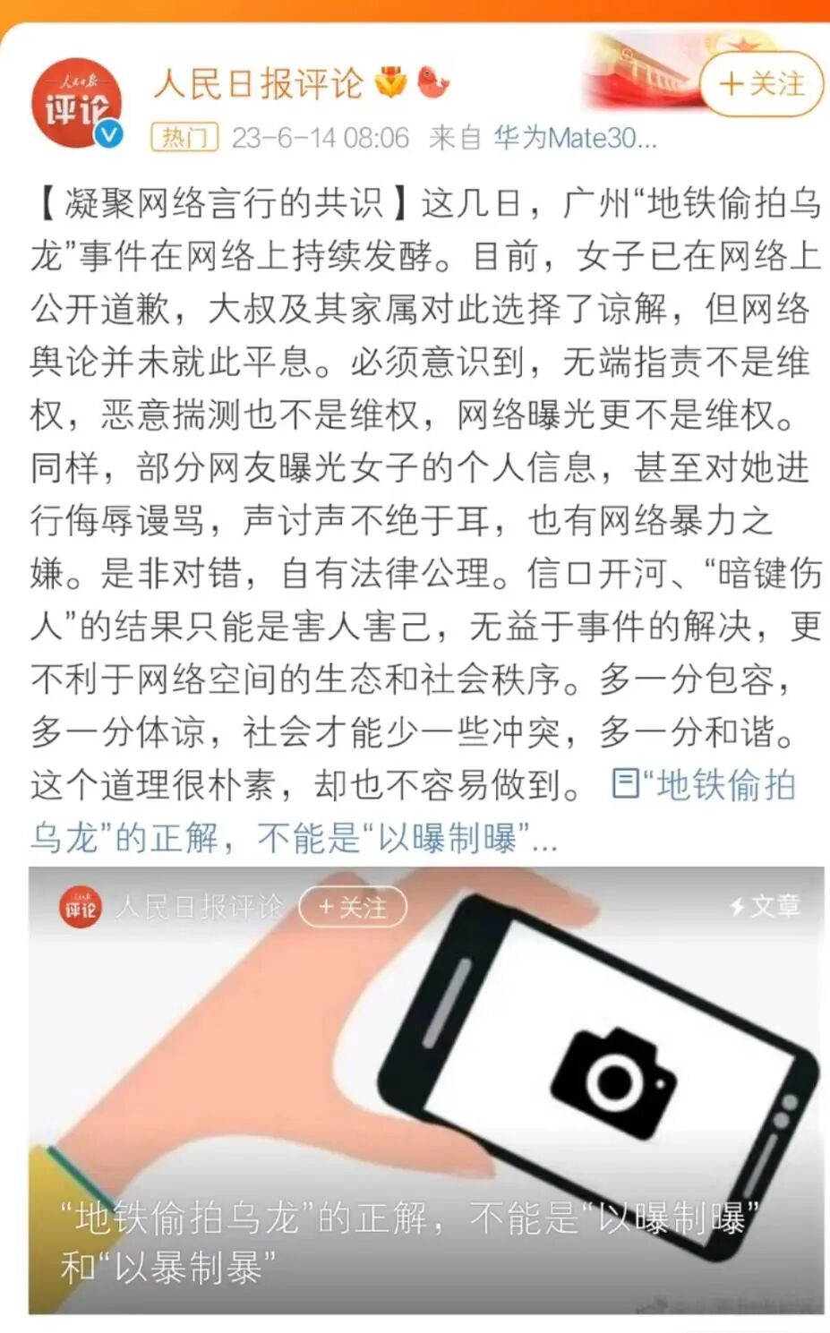 2023年6月7日,广州地铁8号线上,一男性乘客蹲在地上玩手机时被一女子怀疑偷拍,女子要求该男乘客打开手机相册让其检查,以便“自证清白”。随后,该女子在并未发现偷拍照的情况下,仍在微博曝光该男子的视频,并冠以“猥琐男”的标签,称其手法娴熟不是第一次作案,并表示既然没有偷拍,他为什么不为自己发声?真可谓欲加之罪何患无辞。该女子因“维权”不当,引发了广大网友的反感,有人认为其恶意造谣,该女子将微博删除。