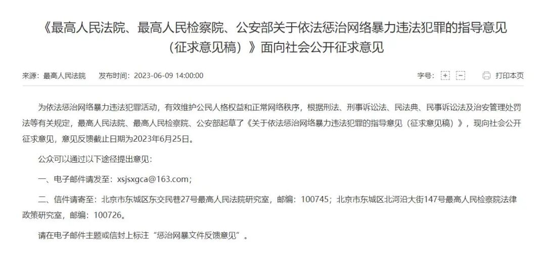 鉴于网络暴力事件越来越频繁、涉及范围越来越广泛,已经成为需要单独规制的社会现象,2023年6月9日,最高人民法院、最高人民检察院、公安部联合发布《关于依法惩治网络暴力违法犯罪的指导意见(征求意见稿)》,向社会公开征求意见。