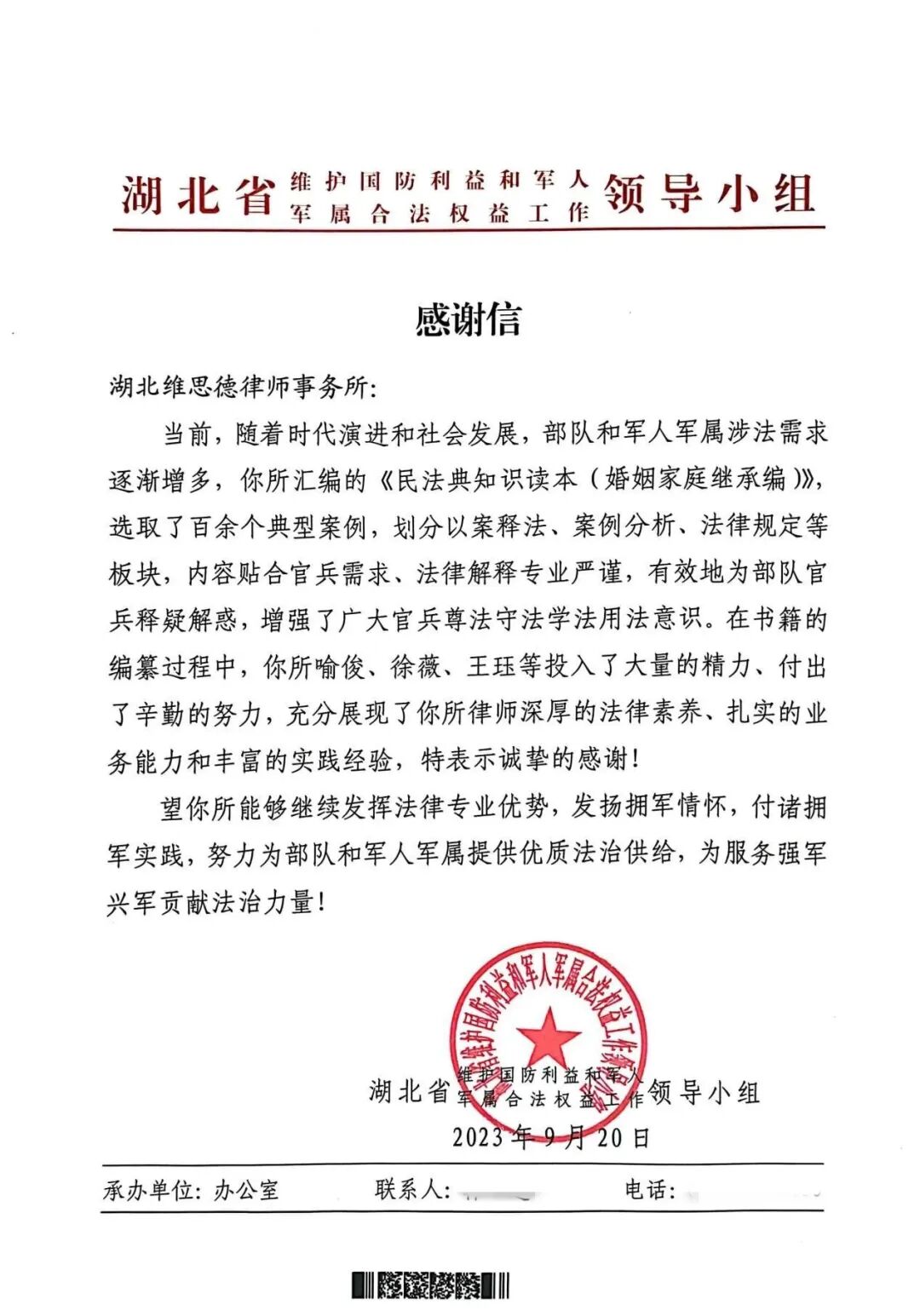近日,湖北维思德律师事务所收到一封来自湖北省维护国防利益和军人军属合法权益工作领导小组发来的感谢信,对本所律师在切实回应部队和军人军属涉法需求,提升广大官兵法治意识等普法宣传工作上给予的支持表示感谢。