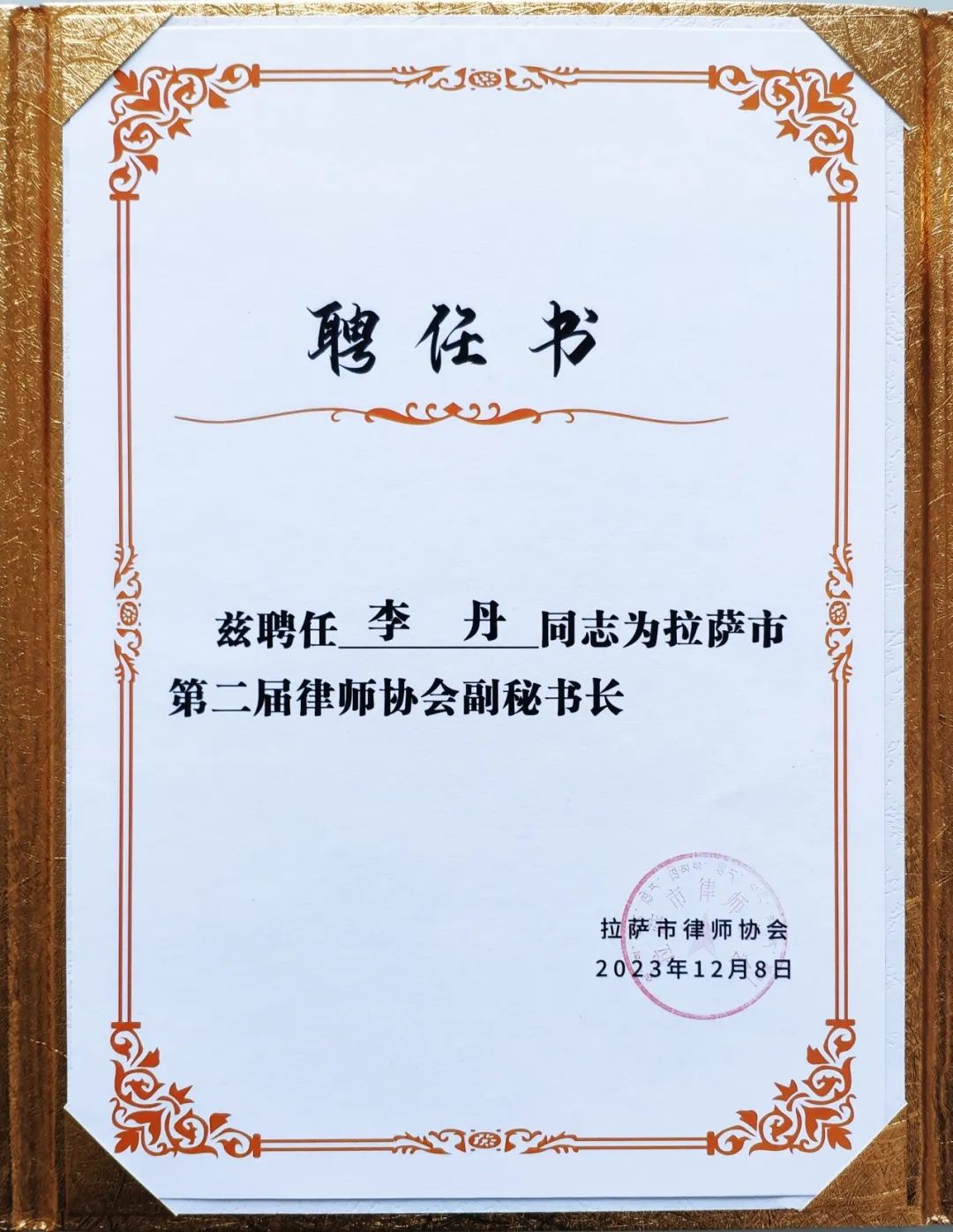 2023年,聘任为拉萨市第二届律师协会常务理事、副秘书长