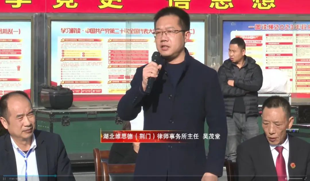 2023年12月4日,是我国第十个国家宪法日,第六个“宪法宣传周”,为加大法治宣传力度,践行我所对普法宣传工作的支持,湖北维思德(荆门)律师事务所吴茂堂主任、王小雨律师来到荆门市东宝工业园区新桥村参加由湖北省荆门市人大、荆门市司法局联合主办的融媒体访谈节目《代表来了》。