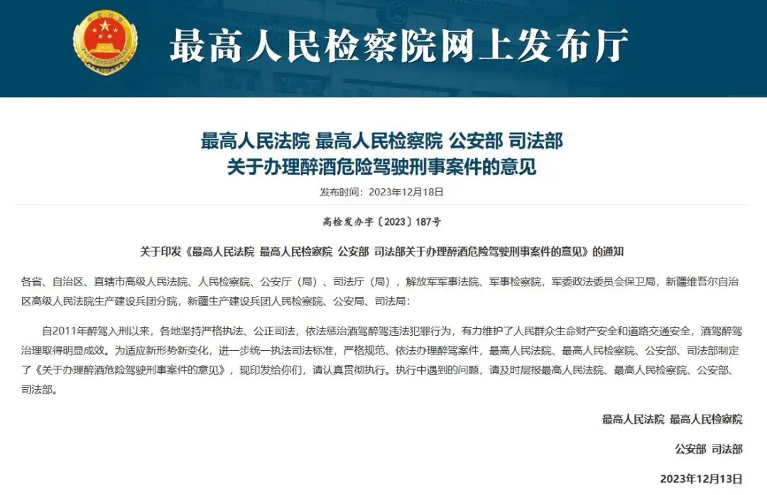 12月18日,最高人民法院、最高人民检察院、公安部、司法部联合发布《关于办理醉酒危险驾驶刑事案件的意见》(以下简称“新《意见》”),已于2023年12月28日正式施行。新《意见》是对10年前《关于办理醉酒驾驶机动车刑事案件适用法律若干问题的意见》(以下简称“旧《意见》”)的补充和完善,新《意见》正式施行后,旧《意见》已失效。