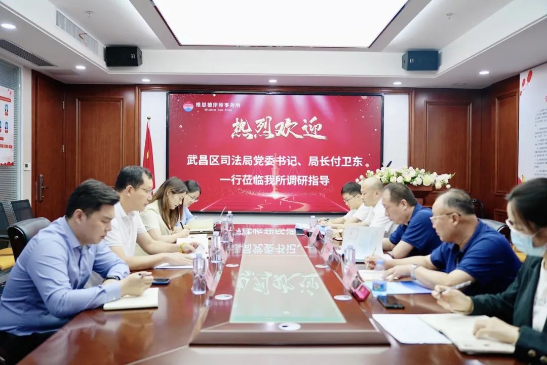 6月15日,武汉市武昌区司法局党委书记、局长付卫东,党委委员、副局长吴丙安,律师工作科科长刘宏伟等一行莅临我所调研指导,开展“零号员工陪伴成长”专项行动。我所高级合伙人喻俊律师,优秀青年律师代表刘小蓉律师、武磊律师等人热情接待并参与座谈交流。