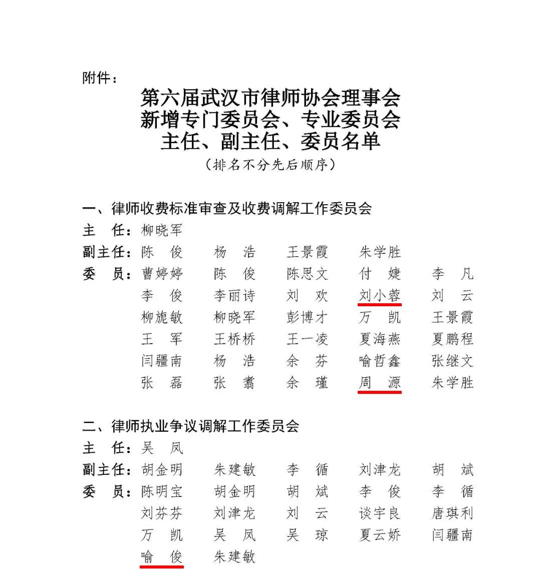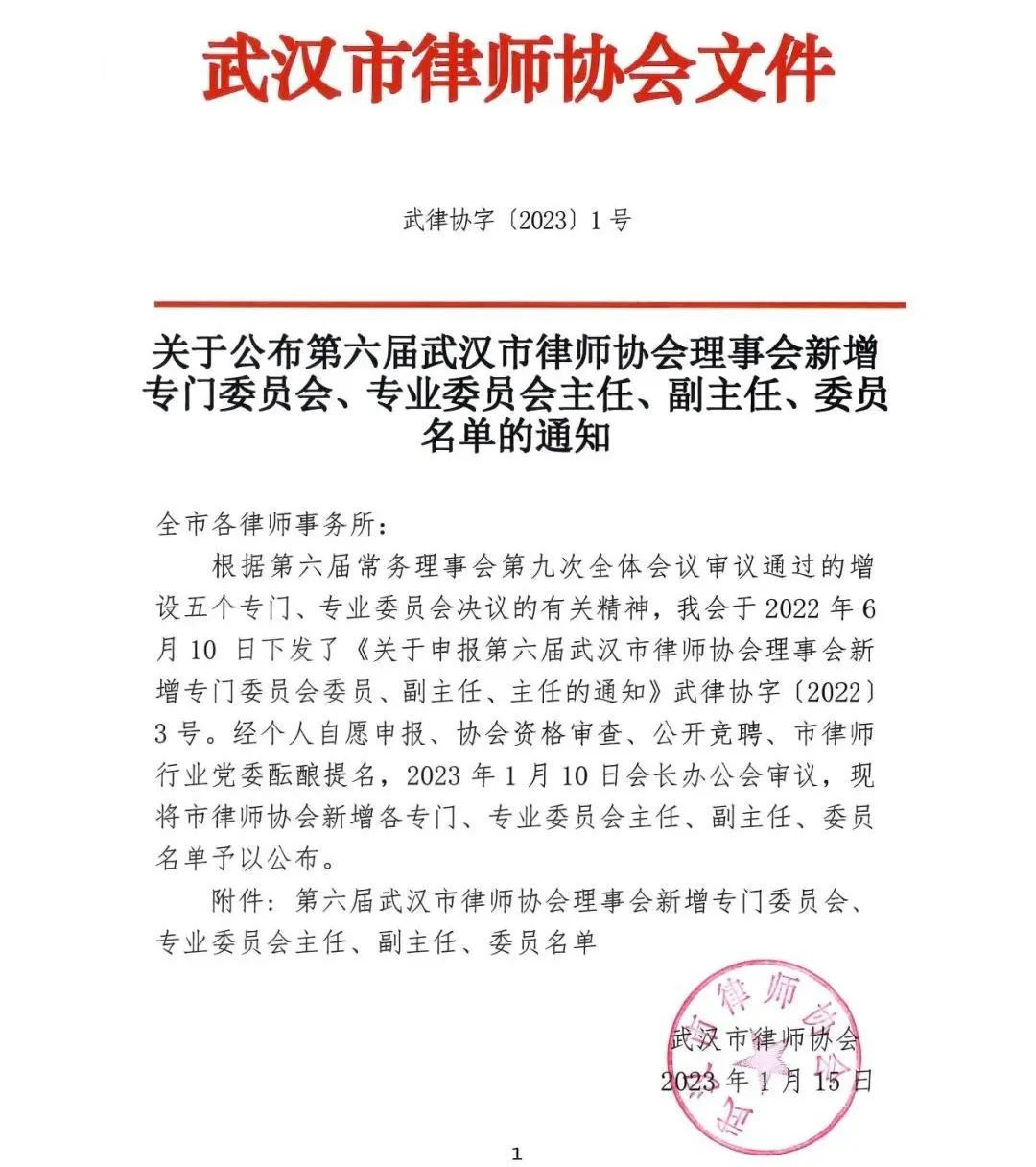 1月15日,武汉市律协发布《关于公布第六届武汉市律师协会理事会新增专门委员会、专业委员会主任、副主任、委员名单的通知》,维思德律所7名律师当选,其中: