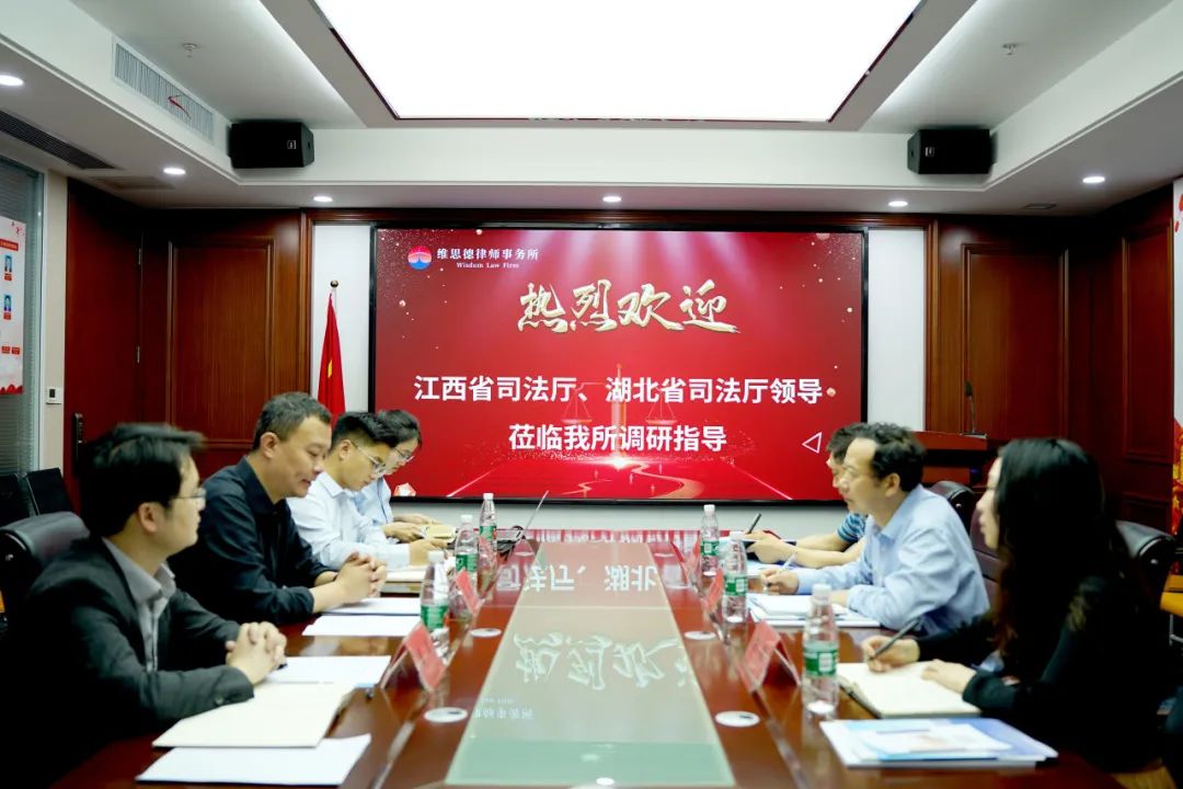 4月19日上午,江西省司法厅二级巡视员、律师工作处负责人唐锋,江西省司法厅律师工作处四级主任科员方明,在湖北省司法厅律师工作处三级调研员董德强的陪同下,莅临湖北维思德律师事务所调研指导工作。我所高级合伙人苗峰律师与雷洋、刘毅律师等人热情接待,陪同参观并参与座谈。