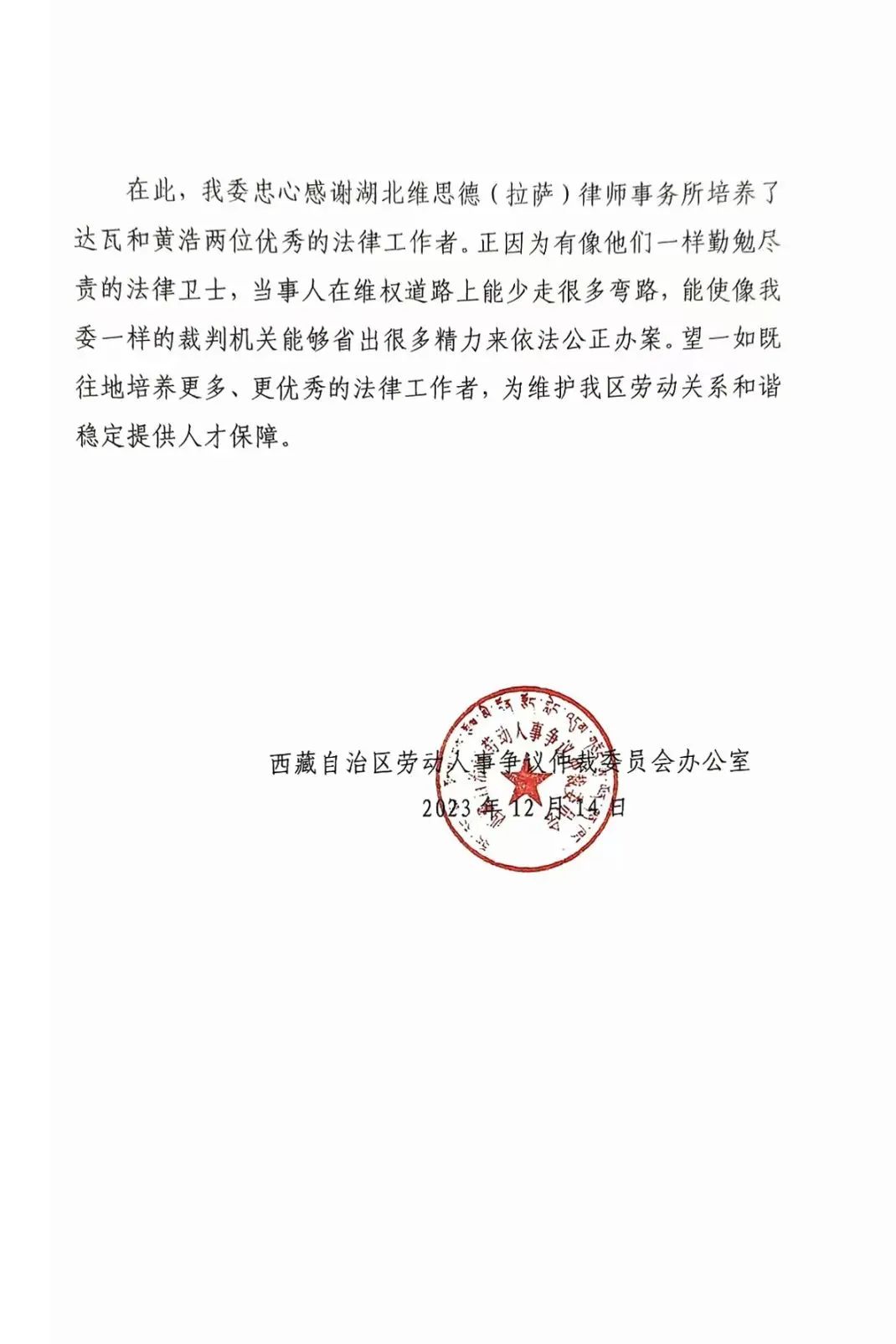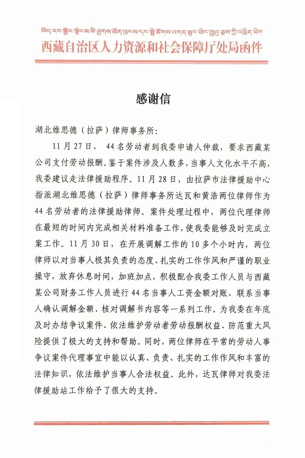 12月14日,维思德拉萨分所收到了西藏自治区人力资源和社会保障厅的一封感谢信。信中对我所达瓦和黄浩两位律师助力西藏劳动人事争议仲裁委解决劳动报酬权益纠纷提供的极大支持和帮助表达了真挚的感谢,并对两位律师的辛勤付出和积极贡献表示充分认可。