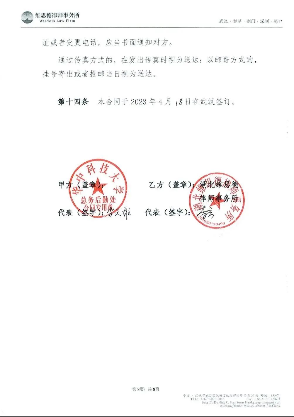4月21日,湖北维思德律师事务所正式获聘为华中科技大学总务后勤处2023-2024年度的常年法律顾问。