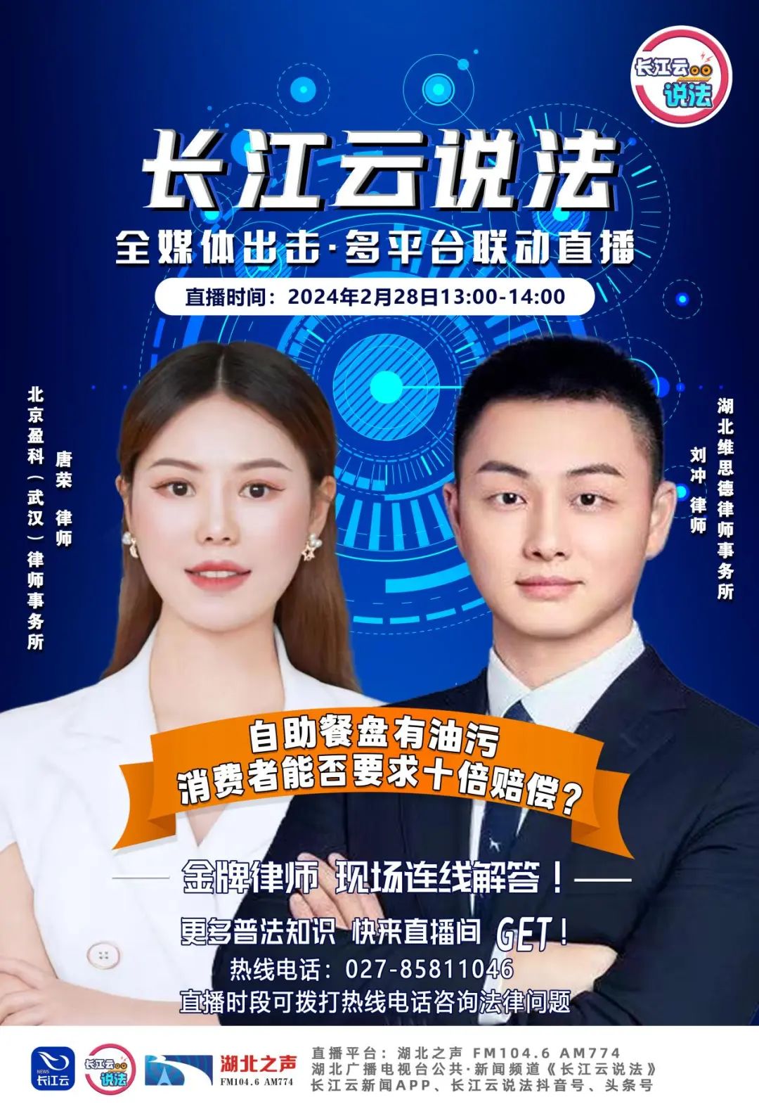 《长江说法》是湖北广播电视台首个“广播+电视+新媒体”三位一体的新闻品牌栏目。《长江说法》广播版时长1小时,以“嘉宾访谈+热线互动”为主,邀请法官、检察官、律师、仲裁员等嘉宾做客直播间,追社会热点、聊法理人情。湖北之声FM104.6 AM774、湖北广播电视台公共·新闻频道、长江云新闻App、抖音号等多平台联动直播。
