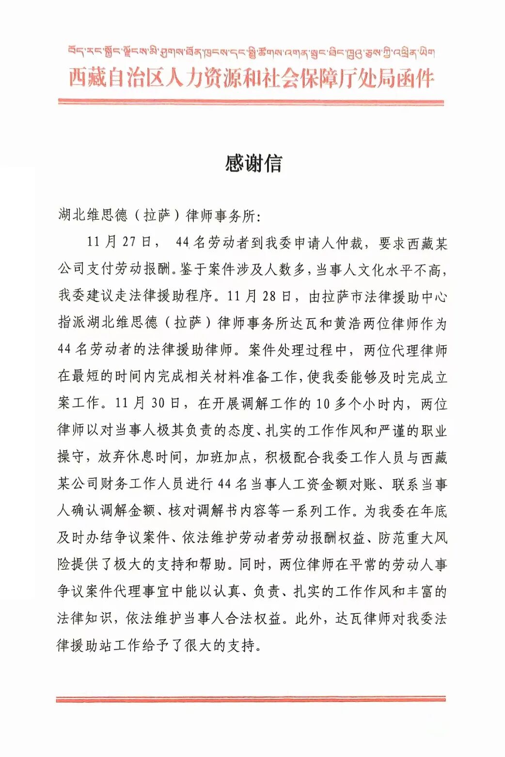 感谢信+1!法援追薪暖人心,维思德拉萨分所达瓦、黄浩两位律师获西藏自治区人力资源和社会保障厅感谢信