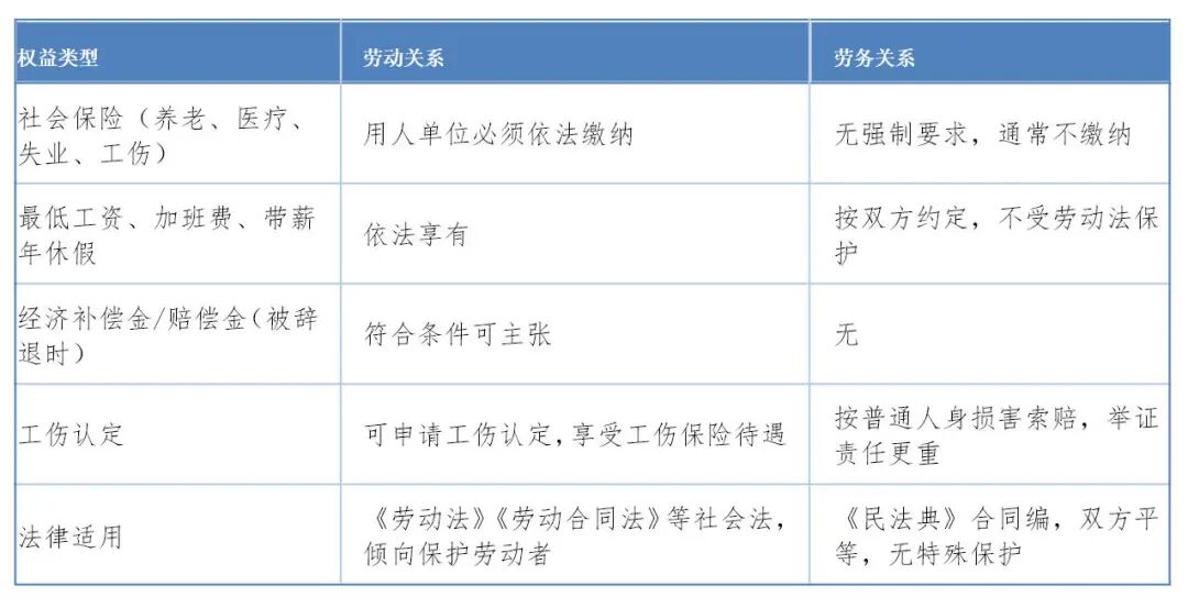 2026年全国两会期间,超龄劳动者权益保障成为热议话题。有委员建议修改《劳动法》,增设“第三类劳动形态”;有代表呼吁尽快出台《超龄劳动者基本权益保障暂行规定》,推动“特殊劳动关系”落地。这些建议背后,是一个长期困扰司法实践的老问题:许多劳动者在步入花甲之年后被用人单位“一刀切”式地终止劳动关系,劳动者的相关权益难以保障。那么根据现行法律规定,劳动者在达到法定退休年龄后,和用人单位之间,究竟是“劳动关系”,还是“劳务关系”?法律对两种关系的保护力度相差甚远,对“劳动关系”的保护远高于“劳务关系”。(见下文对比表格)